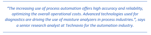 Technavio’s analysts have identified the increasing industrial and process automation to be one of the major industrial moisture analyzers market drivers. The demand for process and industrial automation is increasing due to the rising need to enhance the overall efficiency of an industrial plant. To reduce plant downtime and increase plant productivity, the installation rate of automation solutions such as PLC, SCADA, MES, and DCS has increased considerably. These solutions aid industry players in the easy incorporation of Big Data analytics in processes.