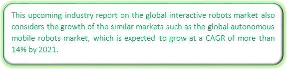 Technavio’s research and analysis on the interactive robots market identifies the ease of operating these robots to be one of the primary factors that will have a positive impact on the market’s growth during the next few years. Interactive robots have a simple architecture and are provided with smart sensors and artificial intelligence to carry the required operations. This will influence their adoption in the society. Additionally, the availability of platforms such as Google play that makes it easy to upgrade these robots also increases their adoption. Moreover, the availability of open source architecture also makes it easy to configure these robots according to the needs and can also update the software. In the coming years, vendors will start offering simple solutions which will also fuel the adoption of these robots. Our market research analysts estimate that the interactive robots market will grow at an impressive CAGR of almost 75% by 2021.