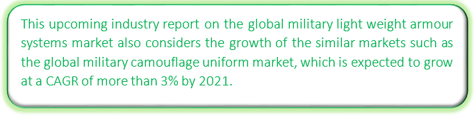 The upcoming research report on the global military light weight armor systems market is an integral part of the aerospace and defense industry. Technavio provides a large collection of research reports on the defense sector by gathering business intelligence data across various parameters. The upcoming research report on the global military light weight armor systems market helps the client monitor the demand-supply shifts in this industry by inspecting factors such as global sales, expected demand, potential growth, and geographic markets.