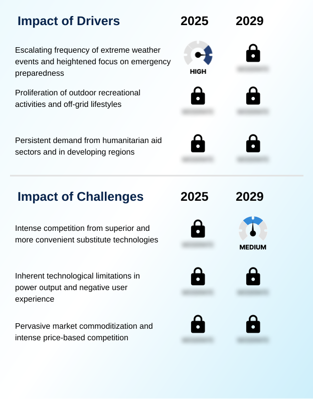 The market faces a formidable challenge from technologically superior and more convenient substitute products. The most significant threat comes from the ubiquitous portable power bank and larger portable power stations, which have seen remarkable advancements in energy density and affordability. Their primary advantage is convenience, providing a silent, immediate, and effort-free source of power that aligns with modern consumer expectations. Unlike a device requiring manual power generation, a power bank delivers its stored charge instantly. This is a critical factor in a market where Europe holds 19.27% of the growth opportunity. A second major substitute is the portable solar charger, which offers passive, renewable energy generation, a powerful counterpoint to the active nature of hand cranking, limiting the market potential of human-powered generator devices.A fundamental challenge is rooted in the inherent physical and technological limitations of the product, which directly impact power output and user experience. The core function relies on converting human mechanical energy into electricity, a process that is fundamentally inefficient and yields low power output. This creates a significant mismatch with the escalating energy demands of modern electronics. Using a device for mechanical-to-electrical conversion to fully charge a contemporary smartphone is a time-consuming and physically demanding task. This low rate of return on physical effort renders the device impractical for anything beyond the most dire emergencies. The act of sustained cranking is physically fatiguing, and the noise and vibration produced stand in stark contrast to the silent functionality of its substitutes.